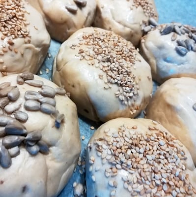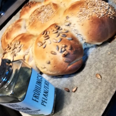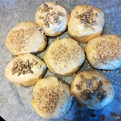 Die lauwarme Reismilch in eine Schüssel leeren. Mehl, Salz-Kräuter-Mischung, Trockengerm und die zimmerwarme Butter dazugeben und zu einem Germteig verkneten (der Teig sollte für 10 Minuten gut durchgeknetet werden). Anschließend für 20 Minuten zugedeckt in einer Schüssel gehen lassen. Wie ihr am Bild seht, geht der Teig während dieser Zeit wunderbar auf. Danach in 65 g Stücke aufteilen und diese zu runden Kugeln formen. Die Kugeln kreisförmig anordnen, mit Wasser besprühen und mit Sesam und Sonnenblumenkernen bestreuen. Bei 230 Grad im vorgeheizten Backrohr ca. 20 Minuten backen. Sobald die Weckerl schön goldbraun sind aus dem Rohr nehmen und abkühlen lassen. Ich wünsche euch gutes Gelingen und genussvolle Momente!